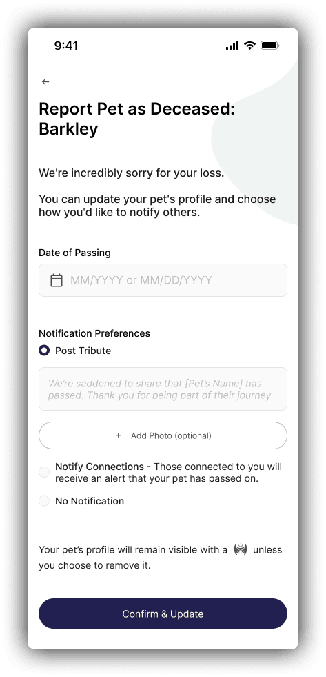 Additionally, we added a sensitive way for users to mark a pet as deceased. Honoring the emotional realities of pet ownership without erasing important memories.