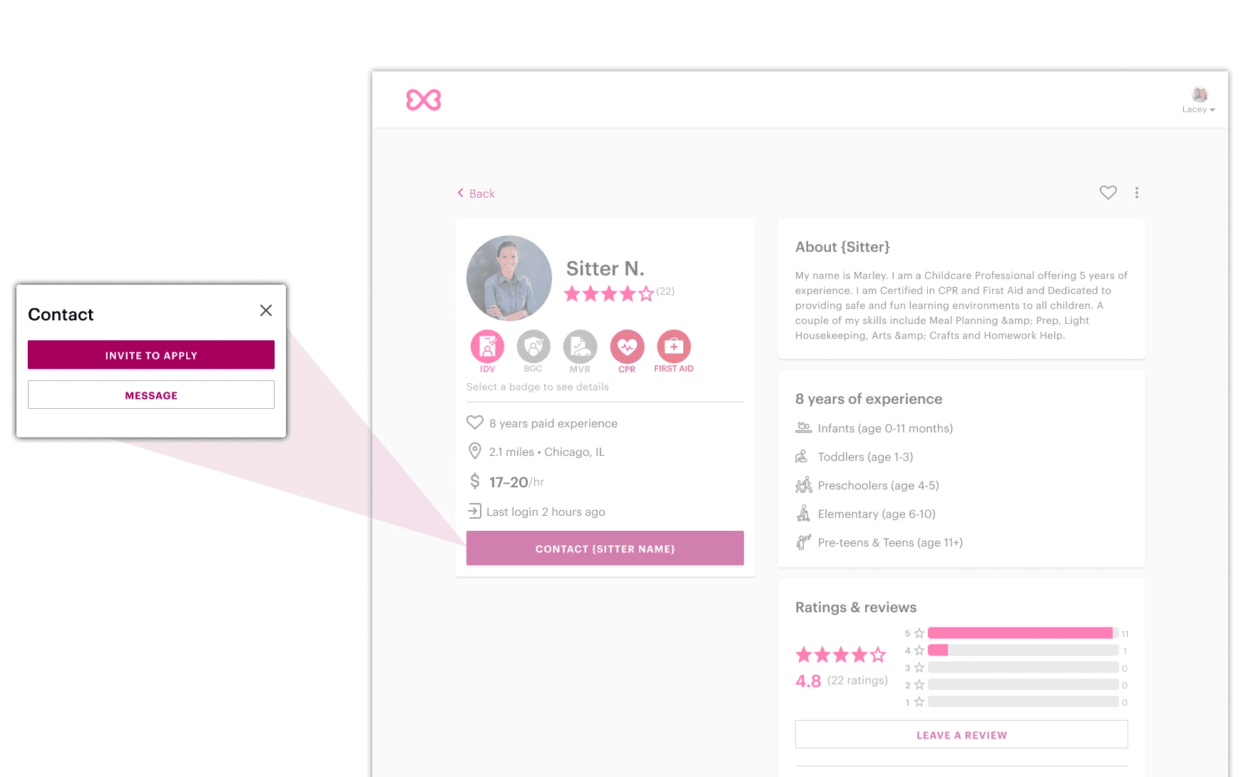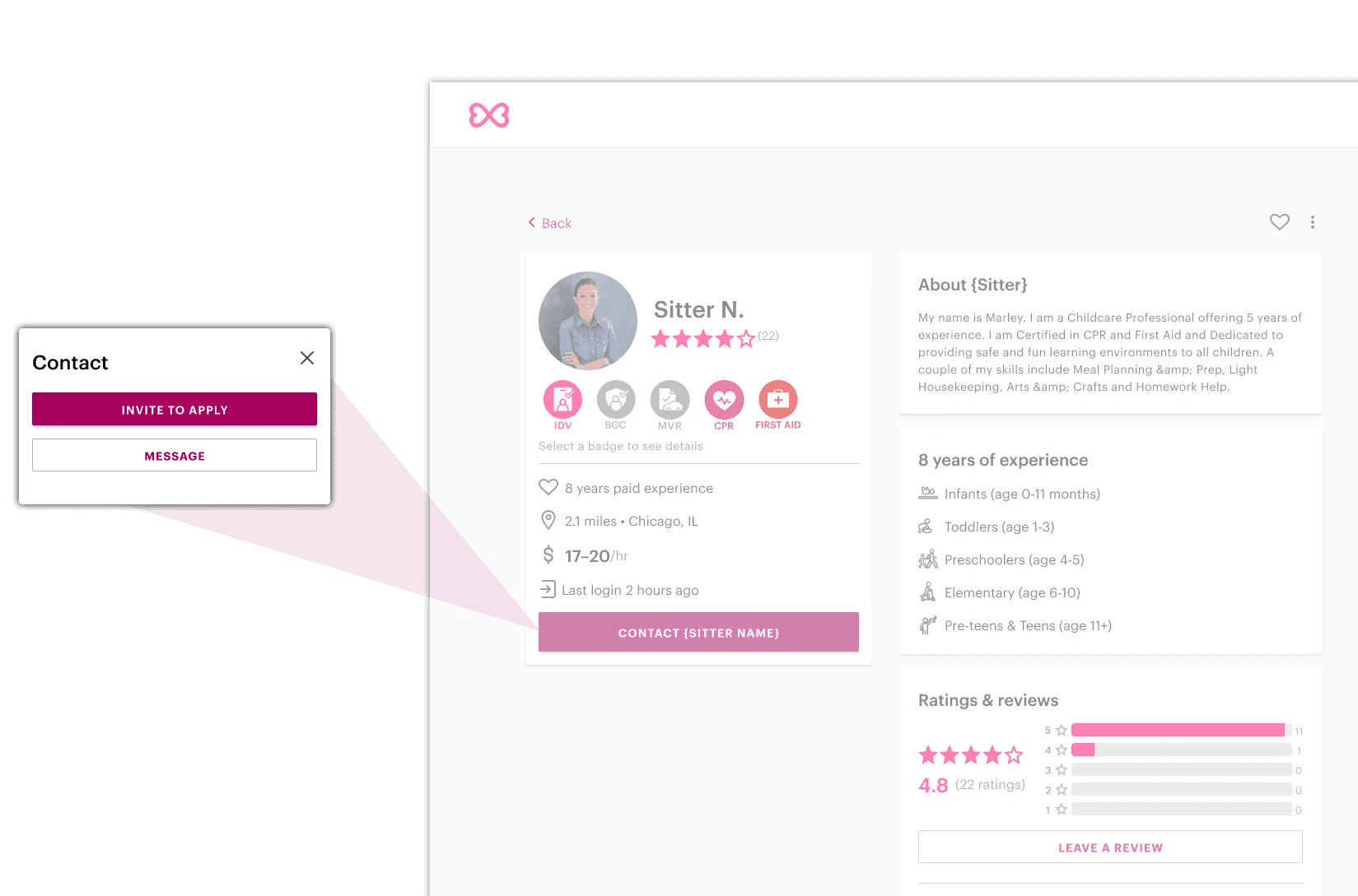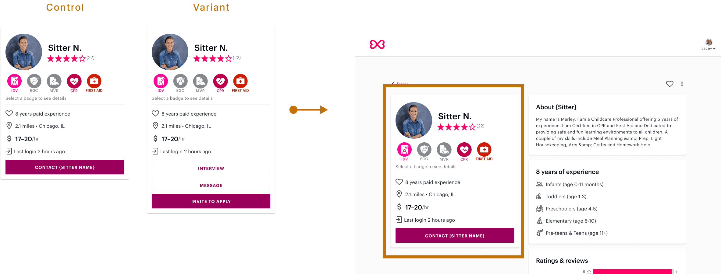 Variant A -> "invite to apply" button surfaced prominently on sitter profiles